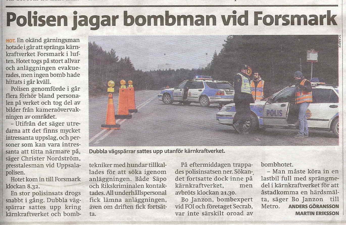 Media Coverage of SECRAB Security ResearchHoped to survive. This is a "concussion tube". (Hoppades överleva. Detta är knallskott. In Swedish). Aftonbladet, 28 August 2008 http://www.aftonbladet.se/sportbladet/fotboll/allsvenskan/article3180289.ab False evidence pointed out Soviet Submarines (Falska bevis pekade ut sovjetiska ubåtar. In Swedish.) Uppdrag Granskning, Wednesday 11 June 2008 at 2000 hrs, SVT1. svt.se/svt/road/Classic/shared/mediacenter/index.jsp?&d=14750&lid=lista_1106245&lpos=5 How the experts would want to save lives of policemen and -women (Så vill experterna rädda polisliv, in Swedish). Polistidningen, Stockholm, 7/8, December 2007, pp 44-47 (author: Örjan Grahn) Part 1 , Part 2 Muhammed pictures may affect Swedish Companies http://www.dagen.se/dagen/Article.aspx?ID=141031 Dagen, 07-09-06 20000 Iraqi refugees come to Sweden annually. Do Iraqi Refugees in Sweden constitute a terrorism risk? Interview, Al Jazeera English Television, 07-04-15 Police hunts bomber at Forsmark Nuclear Power Plant. Polisen jagar bombman vid Forsmark , Metro 07-03-22 p 2 , Polisen jagar bombman vid Forsmark , Metro Web 07-03-21